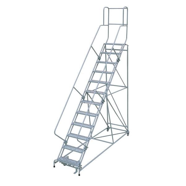 Rolling Ladder, Material Steel, Platform Height 10 ft, Handrails Included Yes, Handrail Height 3.5 ft, Overall Height 13.5 ft, Number of Steps 12, Unassembled, Load Capacity 450 lb, Step Tread Expanded Metal, Platform Depth 24 in, Platform Width 24 in, Bottom Width 32 in, Base Depth 128 in, Overall Width 32 in, Climbing Angle 50 Degrees , Step Depth 7 in, Step Width 24 in, Ladder Actuation Foot Activated Step Lock, Finish Powder Coated, Color Gray, Standards ANSI, OSHA Compliant