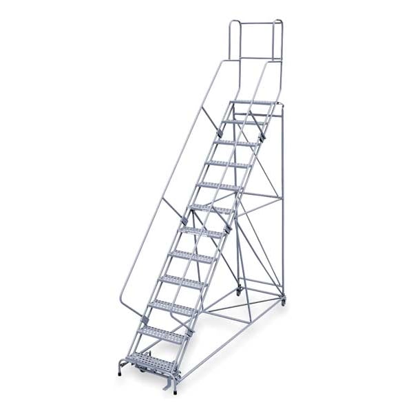 Rolling Ladder, Material Steel, Platform Height 10 ft, Handrails Included Yes, Handrail Height 3.5 ft, Overall Height 12.5 ft, Number of Steps 12, Unassembled, Load Capacity 800 lb, Step Tread Serrated, Platform Depth 24 in, Platform Width 24 in, Bottom Width 32 in, Base Depth 128 in, Overall Width 32 in, Climbing Angle 50 Degrees , Step Depth 7 in, Step Width 24 in, Ladder Actuation Foot Activated Step Lock, Finish Powder Coated, Color Gray, Standards ANSI, OSHA Compliant