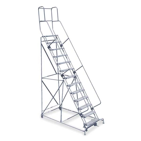 Rolling Ladder, Material Steel, Platform Height 10.8 ft, Handrails Included Yes, Handrail Height 3.5 ft, Overall Height 14.3 ft, Number of Steps 13, Unassembled, Load Capacity 450 lb, Step Tread Serrated, Platform Depth 20 in, Platform Width 24 in, Bottom Width 42 in, Base Depth 105 in, Overall Width 42 in, Climbing Angle 59 Degrees , Step Depth 7 in, Step Width 24 in, Ladder Actuation Foot Activated Step Lock, Finish Powder Coated, Color Gray, Standards ANSI, OSHA Compliant