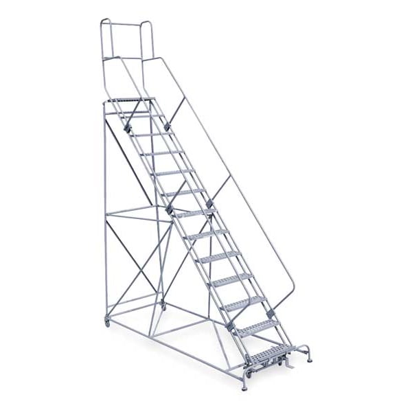 Rolling Ladder, Material Steel, Platform Height 10.8 ft, Handrails Included Yes, Handrail Height 3.5 ft, Overall Height 14.3 ft, Number of Steps 13, Unassembled, Load Capacity 800 lb, Step Tread Antislip Vinyl, Platform Depth 12 in, Platform Width 24 in, Bottom Width 42 in, Base Depth 125 in, Overall Width 42 in, Climbing Angle 50 Degrees , Step Depth 7 in, Step Width 24 in, Ladder Actuation Foot Activated Step Lock, Finish Powder Coated, Color Gray, Standards ANSI, OSHA Compliant, Rear Exit No