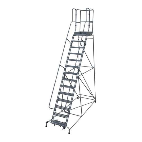 Rolling Ladder, Material Steel, Platform Height 11.7 ft, Handrails Included Yes, Handrail Height 3.5 ft, Overall Height 15.2 ft, Number of Steps 14, Unassembled, Load Capacity 450 lb, Step Tread Serrated, Platform Depth 20 in, Platform Width 30 in, Bottom Width 42 in, Base Depth 198 in, Overall Width 44 in, Climbing Angle 59 Degrees , Step Depth 7 in, Step Width 30 in, Ladder Actuation Foot Activated Step Lock, Finish Powder Coated, Color Gray, Standards ANSI, OSHA Compliant, Rear Exit No