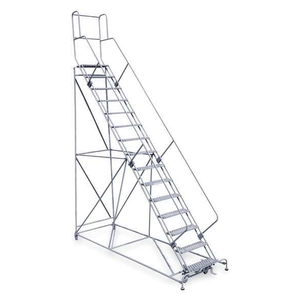 Rolling Ladder, Material Steel, Platform Height 12.5 ft, Handrails Included Yes, Handrail Height 3.5 ft, Overall Height 16 ft, Number of Steps 15, Unassembled, Load Capacity 800 lb, Step Tread Antislip Vinyl, Platform Depth 12 in, Platform Width 24 in, Bottom Width 42 in, Base Depth 143 in, Overall Width 42 in, Climbing Angle 50 Degrees , Step Depth 7 in, Step Width 24 in, Ladder Actuation Foot Activated Step Lock, Finish Powder Coated, Color Gray, Standards ANSI, OSHA Compliant, Rear Exit No