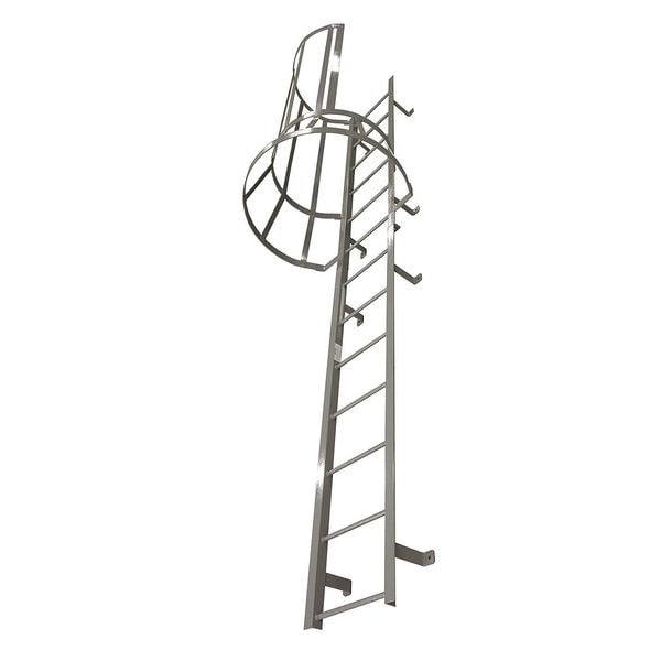 Fixed Ladder with Safety Cage, Walk-Thru Included No, Exit Right, Overall Height 29 ft, Overall Width 26 in, Material Steel, Load Capacity 300 lb, Number of Steps 30, Top Step Height 29 ft, Rung Dia. 3/4 in, Rung/Step Spacing 12 in, Step Width 16 in, Finish Powder Coated, Standards CAl/OSHA Compliant, Handrail Height Not Applicable