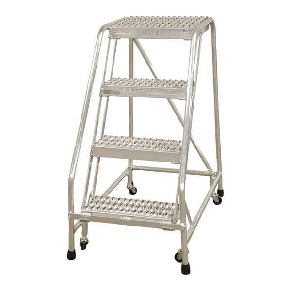 Rolling Ladder, Material Aluminum, Platform Height 3.3 ft, Handrails Included No, Handrail Height 2.5 ft, Overall Height 3.3 ft, Number of Steps 4, Assembled, Load Capacity 350 lb, Step Tread Ribbed, Platform Depth 14 in, Platform Width 16 in, Bottom Width 22 in, Base Depth 36 in, Overall Width 22 in, Climbing Angle 59 Degrees , Step Depth 7 in, Step Width 16 in, Ladder Actuation Spring-Loaded Casters, Finish Aluminum Acid Brightened, Color Gray, Standards ANSI, OSHA Compliant, Rear Exit No