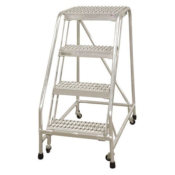 Rolling Ladder, Material Aluminum, Platform Height 3.3 ft, Handrails Included No, Handrail Height Not Applicable, Overall Height 3.3 ft, Number of Steps 4, Assembled, Load Capacity 350 lb, Step Tread Ribbed, Platform Depth 14 in, Platform Width 24 in, Bottom Width 30 in, Base Depth 36 in, Overall Width 30 in, Climbing Angle 59 Degrees , Step Depth 7 in, Step Width 24 in, Ladder Actuation Spring-Loaded Casters, Finish Aluminum Acid Brightened, Color Gray, Standards ANSI, OSHA Compliant