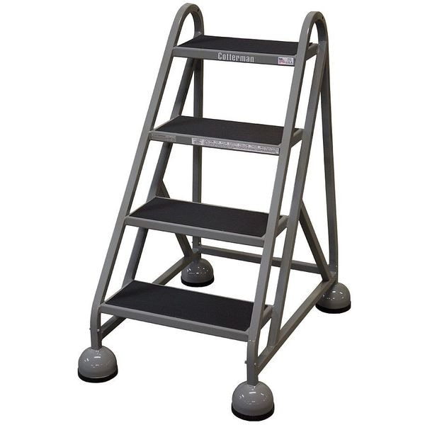 Rolling Ladder, Material Steel, Platform Height 3 ft, Handrails Included No, Handrail Height Not Applicable, Overall Height 3.3 ft, Number of Steps 4, Assembled, Load Capacity 450 lb, Step Tread Antislip Vinyl, Platform Depth 8 in, Platform Width 16 in, Bottom Width 25 in, Base Depth 34 in, Overall Width 25 in, Climbing Angle 56 Degrees , Step Depth 8 in, Step Width 16 in, Ladder Actuation Weight Activated Step Lock, Finish Powder Coated, Color Gray