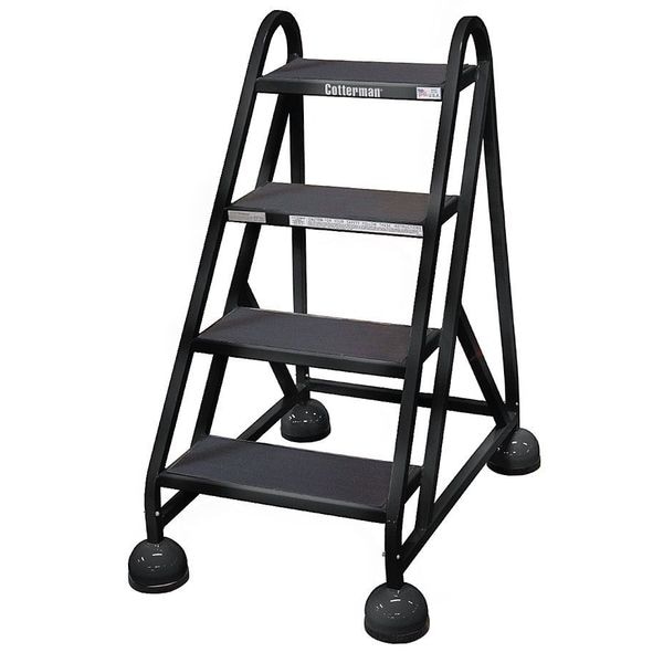 Rolling Ladder, Material Steel, Platform Height 3 ft, Handrails Included No, Handrail Height 30 in, Overall Height 3.3 ft, Number of Steps 4, Assembled, Load Capacity 450 lb, Step Tread Antislip Vinyl, Platform Depth 14 in, Platform Width 16 in, Bottom Width 25 in, Base Depth 39 in, Overall Width 25 in, Climbing Angle 56 Degrees , Step Depth 8 in, Step Width 16 in, Ladder Actuation Weight Activated Step Lock, Finish Powder Coated, Color Black, Standards ANSI, CAl/OSHA Compliant, OSHA Compliant