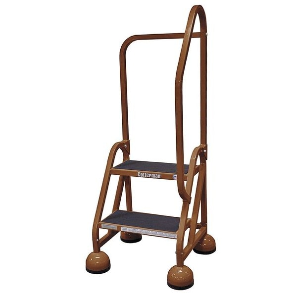 Rolling Ladder, Material Steel, Platform Height 1.5 ft, Handrails Included Yes, Handrail Height 2.5 ft, Overall Height 4 ft, Number of Steps 2, Unassembled, Load Capacity 450 lb, Step Tread Antislip Vinyl, Platform Depth 8 in, Platform Width 16 in, Bottom Width 22 in, Base Depth 20 in, Overall Width 22 in, Climbing Angle 56 Degrees , Step Depth 8 in, Step Width 16 in, Ladder Actuation Weight Activated Step Lock, Finish Powder Coated, Color Brown