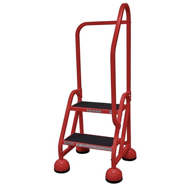 Rolling Ladder, Material Steel, Platform Height 1.5 ft, Handrails Included Yes, Handrail Height 2.5 ft, Overall Height 4 ft, Number of Steps 2, Unassembled, Load Capacity 450 lb, Step Tread Antislip Vinyl, Platform Depth 8 in, Platform Width 16 in, Bottom Width 22 in, Base Depth 20 in, Overall Width 22 in, Climbing Angle 56 Degrees , Step Depth 8 in, Step Width 16 in, Ladder Actuation Weight Activated Step Lock, Finish Powder Coated, Color Red, Standards ANSI, CAl/OSHA Compliant, OSHA Compliant