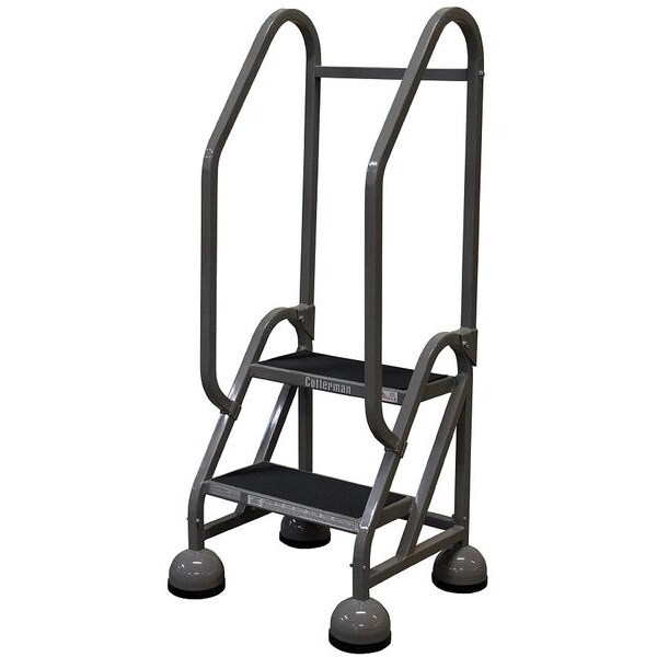 Rolling Ladder, Material Steel, Platform Height 1.5 ft, Handrails Included Yes, Handrail Height 2.5 ft, Overall Height 4 ft, Number of Steps 2, Unassembled, Load Capacity 450 lb, Step Tread Antislip Vinyl, Platform Depth 14 in, Platform Width 16 in, Bottom Width 22 in, Base Depth 26 in, Overall Width 22 in, Climbing Angle 56 Degrees , Step Depth 8 in, Step Width 16 in, Ladder Actuation Weight Activated Step Lock, Finish Powder Coated, Color Gray