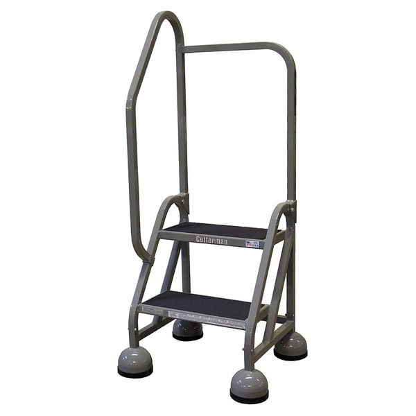 Rolling Ladder, Material Steel, Platform Height 1.5 ft, Handrails Included Yes, Handrail Height 2.5 ft, Overall Height 4 ft, Number of Steps 2, Unassembled, Load Capacity 450 lb, Step Tread Antislip Vinyl, Platform Depth 14 in, Platform Width 16 in, Bottom Width 22 in, Base Depth 26 in, Overall Width 22 in, Climbing Angle 56 Degrees , Step Depth 8 in, Step Width 16 in, Ladder Actuation Weight Activated Step Lock, Finish Powder Coated, Color Gray