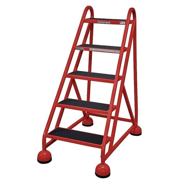 Rolling Ladder, Material Steel, Platform Height 3.8 ft, Handrails Included No, Handrail Height Not Applicable, Overall Height 4.1 ft, Number of Steps 5, Assembled, Load Capacity 450 lb, Step Tread Antislip Vinyl, Platform Depth 14 in, Platform Width 16 in, Bottom Width 26 in, Base Depth 46 in, Overall Width 26 in, Climbing Angle 56 Degrees , Step Depth 8 in, Step Width 16 in, Ladder Actuation Weight Activated Step Lock, Finish Powder Coated, Color Red, Standards ANSI, OSHA Compliant