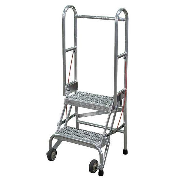 Folding Rolling Ladder, Material Aluminum, Platform Height 1.7 ft, Handrails Included Yes, Handrail Height 2.5 ft, Overall Height 4.2 ft, Number of Steps 2, Assembled, Load Capacity 350 lb, Step Tread Serrated, Platform Depth 10 in, Platform Width 16 in, Bottom Width 20 in, Base Depth 22 in, Overall Width 20 in, Climbing Angle 59 Degrees , Step Depth 7 in, Step Width 16 in, Ladder Actuation None, Finish Aluminum Acid Brightened, Color Gray, Standards ANSI, CAl/OSHA Compliant, OSHA Compliant