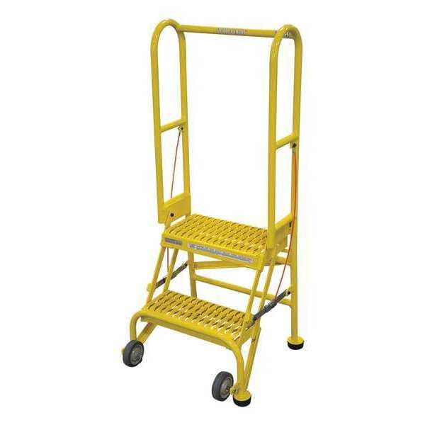 Rolling Ladder, Material Steel, Platform Height 1.7 ft, Handrails Included Yes, Handrail Height 2.5 ft, Overall Height 4.2 ft, Number of Steps 2, Assembled, Load Capacity 350 lb, Step Tread Antislip Vinyl, Platform Depth 10 in, Platform Width 16 in, Bottom Width 21 in, Base Depth 49 in, Overall Width 21 in, Climbing Angle 59 Degrees , Step Depth 7 in, Step Width 16 in, Ladder Actuation None, Finish Powder Coated, Color Yellow, Standards ANSI, CAl/OSHA Compliant, OSHA Compliant, Rear Exit No