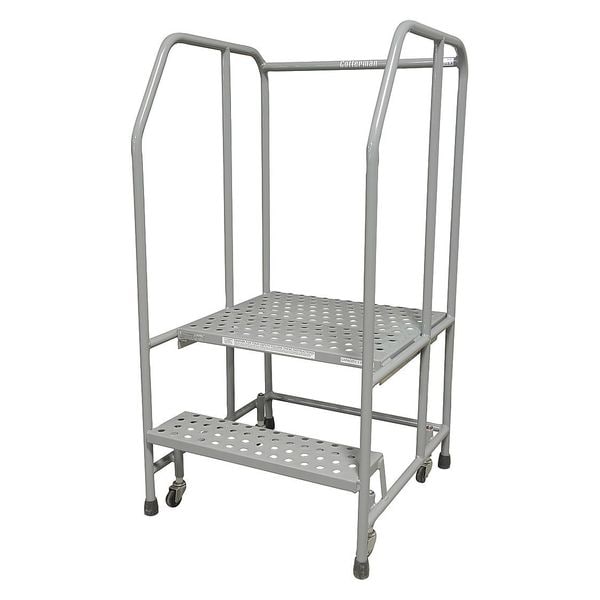 Rolling Ladder, Material Steel, Platform Height 1.7 ft, Handrails Included Yes, Handrail Height 2.5 ft, Overall Height 4.2 ft, Number of Steps 2, Assembled, Load Capacity 450 lb, Step Tread Perforated, Platform Depth 20 in, Platform Width 24 in, Bottom Width 26 in, Base Depth 28 in, Overall Width 26 in, Climbing Angle 59 Degrees , Step Depth 7 in, Step Width 24 in, Ladder Actuation Weight Activated Step Lock, Finish Powder Coated, Color Gray, Standards ANSI, CAl/OSHA Compliant, OSHA Compliant