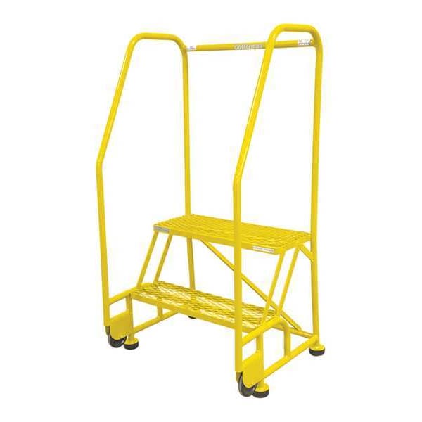 Tilt and Roll Ladder, Material Steel, Platform Height 1.7 ft, Handrails Included Yes, Handrail Height 2.5 ft, Overall Height 4.2 ft, Number of Steps 2, Assembled, Load Capacity 450 lb, Step Tread Serrated, Platform Depth 10 in, Platform Width 16 in, Bottom Width 20 in, Base Depth 24 in, Overall Width 20 in, Climbing Angle 59 Degrees , Step Depth 7 in, Step Width 16 in, Ladder Actuation None, Finish Powder Coated, Color Yellow, Standards ANSI, CAl/OSHA Compliant, OSHA Compliant, Rear Exit No