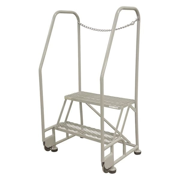Tilt and Roll Ladder, Material Steel, Platform Height 1.7 ft, Handrails Included Yes, Handrail Height 2.5 ft, Overall Height 4.2 ft, Number of Steps 2, Assembled, Load Capacity 450 lb, Step Tread Expanded Metal, Platform Depth 10 in, Platform Width 24 in, Bottom Width 28 in, Base Depth 24 in, Overall Width 28 in, Climbing Angle 59 Degrees , Step Depth 7 in, Step Width 24 in, Ladder Actuation None, Finish Powder Coated, Color Gray, Standards ANSI, CAl/OSHA Compliant, OSHA Compliant