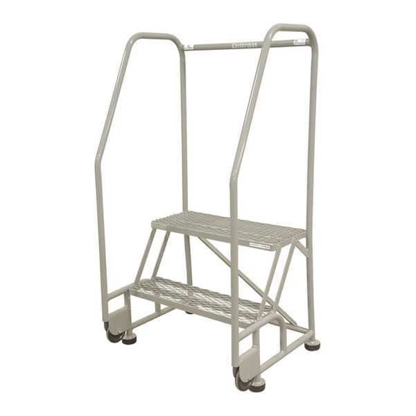 Tilt and Roll Ladder, Material Steel, Platform Height 1.7 ft, Handrails Included Yes, Handrail Height 2.5 ft, Overall Height 4.2 ft, Number of Steps 2, Assembled, Load Capacity 450 lb, Step Tread Serrated, Platform Depth 10 in, Platform Width 24 in, Bottom Width 28 in, Base Depth 24 in, Overall Width 28 in, Climbing Angle 59 Degrees , Step Depth 7 in, Step Width 24 in, Ladder Actuation None, Finish Powder Coated, Color Gray, Standards ANSI, CAl/OSHA Compliant, OSHA Compliant