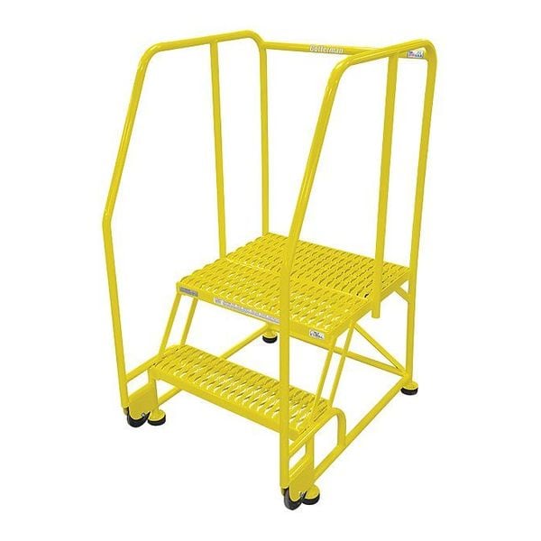 Tilt and Roll Ladder, Material Steel, Platform Height 1.7 ft, Handrails Included Yes, Handrail Height 2.5 ft, Overall Height 4.2 ft, Number of Steps 2, Assembled, Load Capacity 450 lb, Step Tread Serrated, Platform Depth 20 in, Platform Width 24 in, Bottom Width 34 in, Base Depth 28 in, Overall Width 28 in, Climbing Angle 59 Degrees , Step Depth 7 in, Step Width 24 in, Ladder Actuation None, Finish Powder Coated, Color Yellow, Standards ANSI, CAl/OSHA Compliant, OSHA Compliant, Rear Exit No