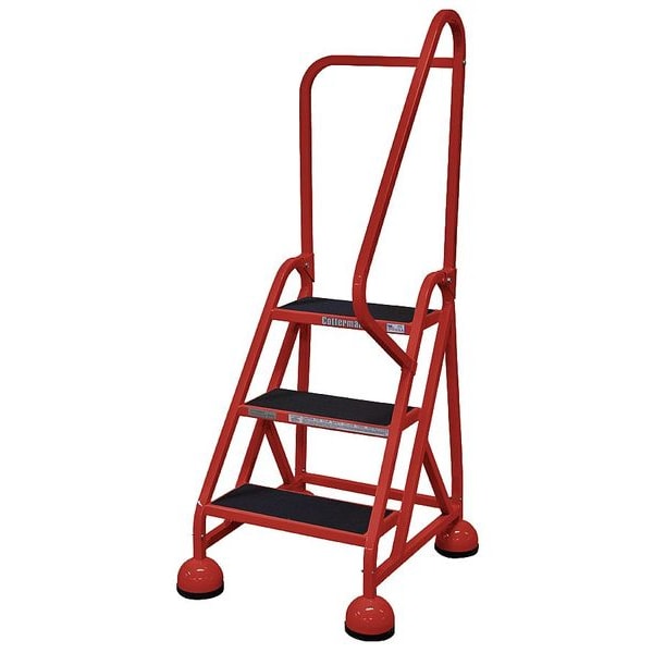 Rolling Ladder, Material Steel, Platform Height 2.3 ft, Handrails Included Yes, Handrail Height 2.5 ft, Overall Height 4.8 ft, Number of Steps 3, Unassembled, Load Capacity 450 lb, Step Tread Antislip Vinyl, Platform Depth 8 in, Platform Width 16 in, Bottom Width 24 in, Base Depth 27 in, Overall Width 24 in, Climbing Angle 56 Degrees , Step Depth 8 in, Step Width 16 in, Ladder Actuation Weight Activated Step Lock, Finish Powder Coated, Color Red