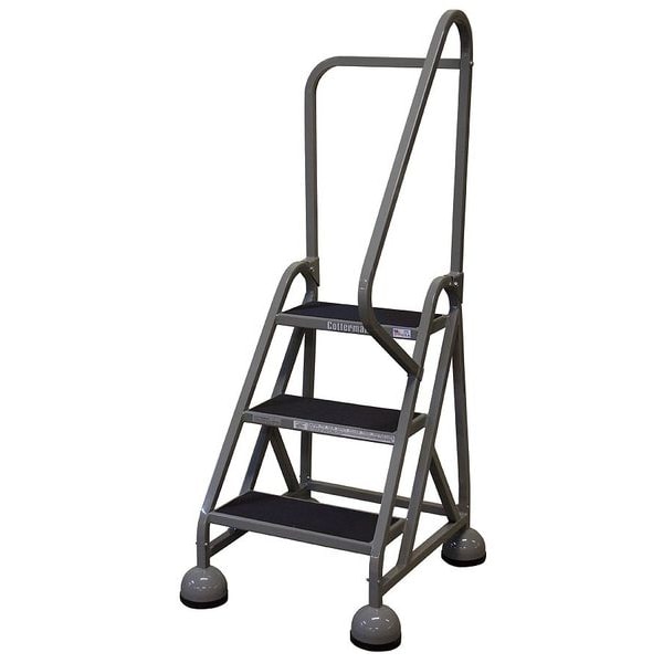 Rolling Ladder, Material Steel, Platform Height 2.3 ft, Handrails Included Yes, Handrail Height 2.5 ft, Overall Height 4.8 ft, Number of Steps 3, Unassembled, Load Capacity 450 lb, Step Tread Antislip Vinyl, Platform Depth 14 in, Platform Width 16 in, Bottom Width 24 in, Base Depth 32 in, Overall Width 24 in, Climbing Angle 56 Degrees , Step Depth 8 in, Step Width 16 in, Ladder Actuation Weight Activated Step Lock, Finish Powder Coated, Color Gray