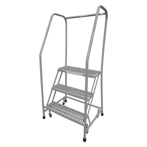 Rolling Ladder, Material Stainless Steel, Platform Height 2.5 ft, Handrails Included Yes, Handrail Height 2.5 ft, Overall Height 5 ft, Number of Steps 3, Assembled, Load Capacity 450 lb, Step Tread Serrated, Platform Depth 10 in, Platform Width 24 in, Bottom Width 30 in, Base Depth 27 in, Overall Width 30 in, Climbing Angle 59 Degrees , Step Depth 7 in, Step Width 24 in, Ladder Actuation Weight Activated Step Lock, Finish Unfinished, Color Not Applicable