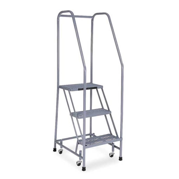 Rolling Ladder, Material Steel, Platform Height 2.5 ft, Handrails Included Yes, Handrail Height 2.5 ft, Overall Height 5 ft, Number of Steps 3, Assembled, Load Capacity 450 lb, Step Tread Expanded Metal, Platform Depth 10 in, Platform Width 16 in, Bottom Width 20 in, Base Depth 26 in, Overall Width 20 in, Climbing Angle 59 Degrees , Step Depth 7 in, Step Width 16 in, Ladder Actuation Weight Activated Step Lock, Finish Powder Coated, Color Gray, Standards ANSI, CAl/OSHA Compliant, OSHA Compliant