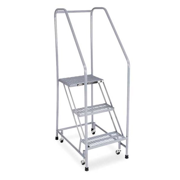 Rolling Ladder, Material Steel, Platform Height 2.5 ft, Handrails Included Yes, Handrail Height 2.5 ft, Overall Height 5 ft, Number of Steps 3, Assembled, Load Capacity 450 lb, Step Tread Expanded Metal, Platform Depth 24 in, Platform Width 16 in, Bottom Width 20 in, Base Depth 44 in, Overall Width 20 in, Climbing Angle 50 Degrees , Step Depth 7 in, Step Width 16 in, Ladder Actuation Weight Activated Step Lock, Finish Powder Coated, Color Gray, Standards ANSI, CAl/OSHA Compliant, OSHA Compliant