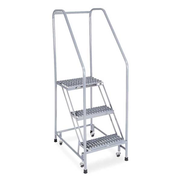 Rolling Ladder, Material Steel, Platform Height 2.5 ft, Handrails Included Yes, Handrail Height 2.5 ft, Overall Height 5 ft, Number of Steps 3, Assembled, Load Capacity 450 lb, Step Tread Serrated, Platform Depth 12 in, Platform Width 16 in, Bottom Width 20 in, Base Depth 32 in, Overall Width 20 in, Climbing Angle 50 Degrees , Step Depth 7 in, Step Width 16 in, Ladder Actuation Weight Activated Step Lock, Finish Powder Coated, Color Gray, Standards ANSI, CAl/OSHA Compliant, OSHA Compliant