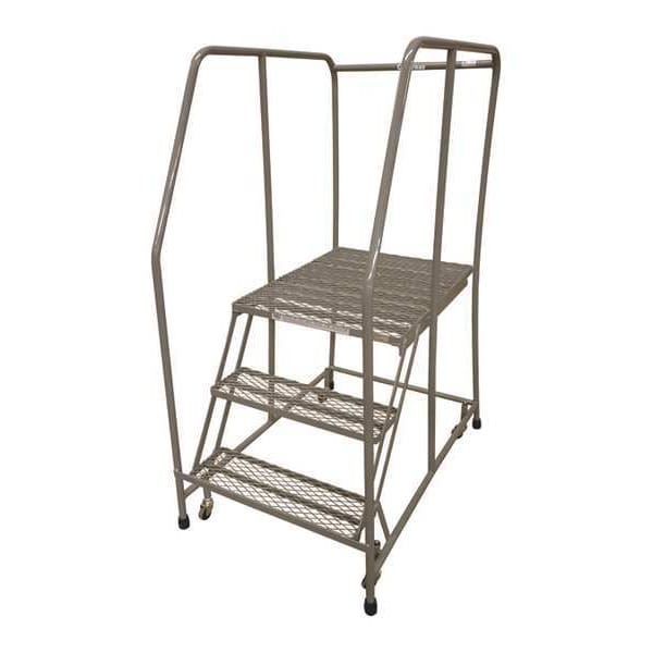 Rolling Ladder, Material Steel, Platform Height 2.5 ft, Handrails Included Yes, Handrail Height 2.5 ft, Overall Height 5 ft, Number of Steps 3, Unassembled, Load Capacity 450 lb, Step Tread Serrated, Platform Depth 30 in, Platform Width 16 in, Bottom Width 21 in, Base Depth 49 in, Overall Width 21 in, Climbing Angle 59 Degrees , Step Depth 7 in, Step Width 16 in, Ladder Actuation Weight Activated Step Lock, Finish Powder Coated, Color Gray, Standards ANSI, CAl/OSHA Compliant, OSHA Compliant
