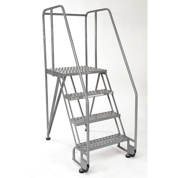 Tilt and Roll Ladder, Material Steel, Platform Height 2.5 ft, Handrails Included Yes, Handrail Height 2.5 ft, Overall Height 5 ft, Number of Steps 3, Assembled, Load Capacity 350 lb, Step Tread Expanded Metal, Platform Depth 20 in, Platform Width 24 in, Bottom Width 28 in, Base Depth 41 in, Overall Width 28 in, Climbing Angle 59 Degrees , Step Depth 7 in, Step Width 24 in, Ladder Actuation None, Finish Powder Coated, Color Gray, Standards ANSI, CAl/OSHA Compliant, OSHA Compliant