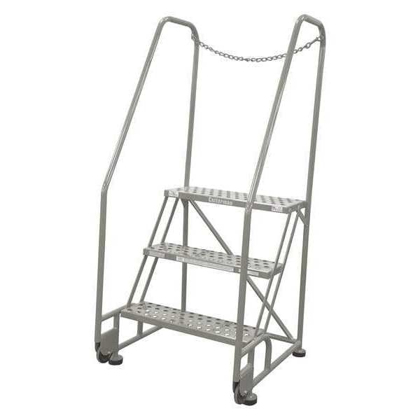 Tilt and Roll Ladder, Material Steel, Platform Height 2.5 ft, Handrails Included Yes, Handrail Height 2.5 ft, Overall Height 5 ft, Number of Steps 3, Assembled, Load Capacity 450 lb, Step Tread Expanded Metal, Platform Depth 10 in, Platform Width 24 in, Bottom Width 28 in, Base Depth 31 in, Overall Width 28 in, Climbing Angle 59 Degrees , Step Depth 7 in, Step Width 24 in, Ladder Actuation None, Finish Powder Coated, Color Gray, Standards ANSI, CAl/OSHA Compliant, OSHA Compliant