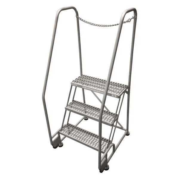 Tilt and Roll Ladder, Material Steel, Platform Height 2.5 ft, Handrails Included Yes, Handrail Height 2.5 ft, Overall Height 5 ft, Number of Steps 3, Assembled, Load Capacity 450 lb, Step Tread Serrated, Platform Depth 10 in, Platform Width 24 in, Bottom Width 28 in, Base Depth 31 in, Overall Width 28 in, Climbing Angle 59 Degrees , Step Depth 7 in, Step Width 24 in, Ladder Actuation None, Finish Powder Coated, Color Gray, Standards ANSI, CAl/OSHA Compliant, OSHA Compliant