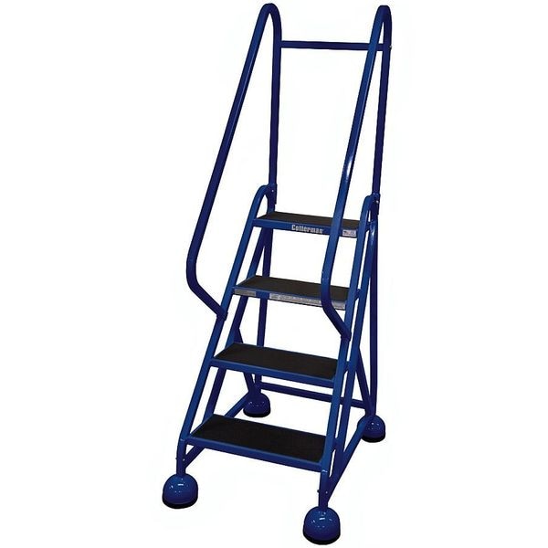 Rolling Ladder, Material Steel, Platform Height 3 ft, Handrails Included Yes, Handrail Height 2.5 ft, Overall Height 5.5 ft, Number of Steps 4, Unassembled, Load Capacity 450 lb, Step Tread Antislip Vinyl, Platform Depth 8 in, Platform Width 16 in, Bottom Width 25 in, Base Depth 34 in, Overall Width 25 in, Climbing Angle 56 Degrees , Step Depth 8 in, Step Width 16 in, Ladder Actuation Weight Activated Step Lock, Finish Powder Coated, Color Blue, Standards ANSI, CAl/OSHA Compliant, OSHA Compliant