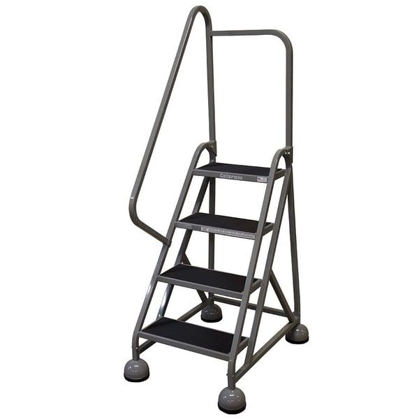 Rolling Ladder, Material Steel, Platform Height 3 ft, Handrails Included Yes, Handrail Height 2.5 ft, Overall Height 5.5 ft, Number of Steps 4, Unassembled, Load Capacity 450 lb, Step Tread Antislip Vinyl, Platform Depth 8 in, Platform Width 16 in, Bottom Width 25 in, Base Depth 34 in, Overall Width 25 in, Climbing Angle 56 Degrees , Step Depth 8 in, Step Width 16 in, Ladder Actuation Weight Activated Step Lock, Finish Powder Coated, Color Gray, Standards ANSI, CAl/OSHA Compliant, OSHA Compliant
