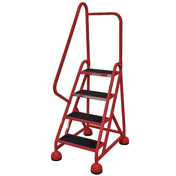 Rolling Ladder, Material Steel, Platform Height 3 ft, Handrails Included Yes, Handrail Height 2.5 ft, Overall Height 5.5 ft, Number of Steps 4, Unassembled, Load Capacity 450 lb, Step Tread Antislip Vinyl, Platform Depth 8 in, Platform Width 16 in, Bottom Width 25 in, Base Depth 34 in, Overall Width 25 in, Climbing Angle 56 Degrees , Step Depth 8 in, Step Width 16 in, Ladder Actuation Weight Activated Step Lock, Finish Powder Coated, Color Red, Standards ANSI, CAl/OSHA Compliant, OSHA Compliant