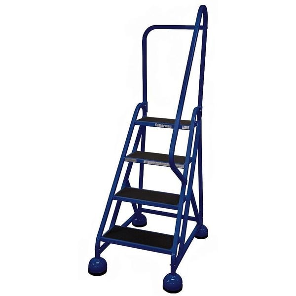 Rolling Ladder, Material Steel, Platform Height 3 ft, Handrails Included Yes, Handrail Height 2.5 ft, Overall Height 5.5 ft, Number of Steps 4, Unassembled, Load Capacity 450 lb, Step Tread Antislip Vinyl, Platform Depth 8 in, Platform Width 16 in, Bottom Width 25 in, Base Depth 34 in, Overall Width 25 in, Climbing Angle 56 Degrees , Step Depth 8 in, Step Width 16 in, Ladder Actuation Weight Activated Step Lock, Finish Powder Coated, Color Blue, Standards ANSI, CAl/OSHA Compliant, OSHA Compliant