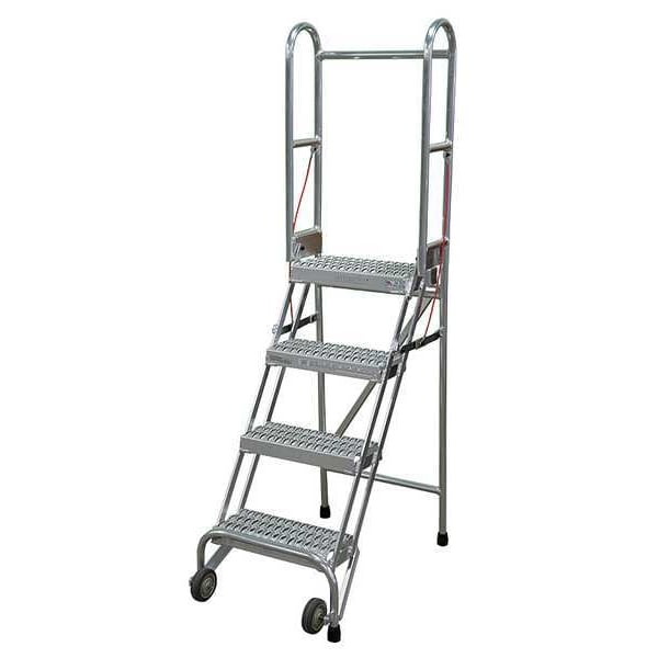 Folding Rolling Ladder, Material Aluminum, Platform Height 3.3 ft, Handrails Included Yes, Handrail Height 2.5 ft, Overall Height 5.8 ft, Number of Steps 4, Assembled, Load Capacity 350 lb, Step Tread Serrated, Platform Depth 10 in, Platform Width 16 in, Bottom Width 20 in, Base Depth 35 in, Overall Width 20 in, Climbing Angle 59 Degrees , Step Depth 7 in, Step Width 16 in, Ladder Actuation None, Finish Aluminum Acid Brightened, Color Gray, Standards ANSI, CAl/OSHA Compliant, OSHA Compliant