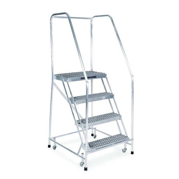 Rolling Ladder, Material Aluminum, Platform Height 3.3 ft, Handrails Included Yes, Handrail Height 2.5 ft, Overall Height 5.8 ft, Number of Steps 4, Assembled, Load Capacity 350 lb, Step Tread Serrated, Platform Depth 14 in, Platform Width 24 in, Bottom Width 30 in, Base Depth 36 in, Overall Width 30 in, Climbing Angle 59 Degrees , Step Depth 7 in, Step Width 24 in, Ladder Actuation Weight Activated Step Lock, Finish Aluminum Acid Brightened, Color Gray