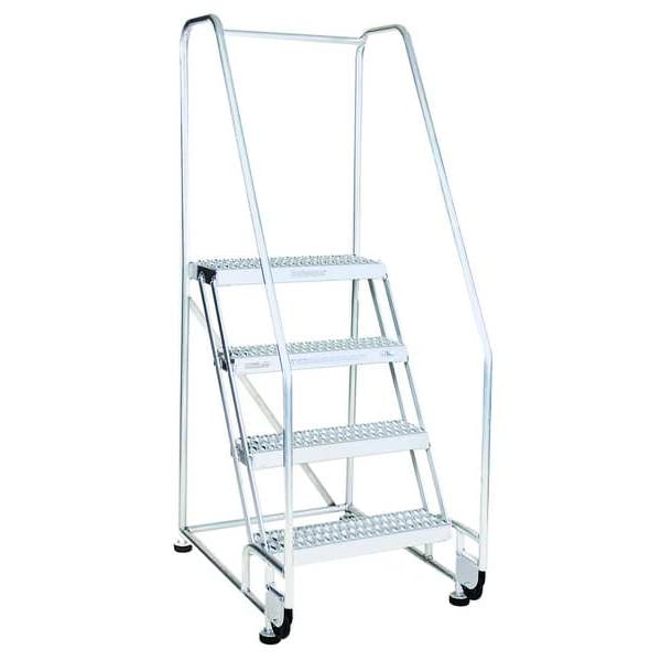 Tilt and Roll Ladder, Material Aluminum, Platform Height 3.3 ft, Handrails Included Yes, Handrail Height 2.5 ft, Overall Height 5.8 ft, Number of Steps 4, Assembled, Load Capacity 350 lb, Step Tread Serrated, Platform Depth 10 in, Platform Width 24 in, Bottom Width 28 in, Base Depth 37 in, Overall Width 28 in, Climbing Angle 59 Degrees , Step Depth 7 in, Step Width 24 in, Ladder Actuation None, Finish Powder Coated, Color Gray, Standards ANSI, CAl/OSHA Compliant, OSHA Compliant