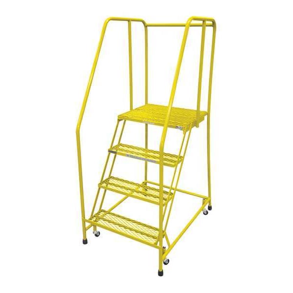 Rolling Ladder, Material Steel, Platform Height 3.3 ft, Handrails Included Yes, Handrail Height 2.5 ft, Overall Height 5.8 ft, Number of Steps 4, Assembled, Load Capacity 450 lb, Step Tread Expanded Metal, Platform Depth 20 in, Platform Width 24 in, Bottom Width 30 in, Base Depth 31 in, Overall Width 30 in, Climbing Angle 59 Degrees , Step Depth 7 in, Step Width 24 in, Ladder Actuation Weight Activated Step Lock, Finish Powder Coated, Color Yellow