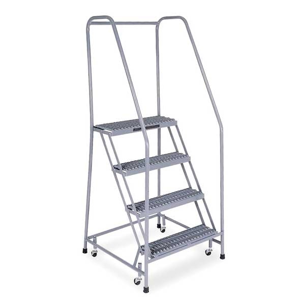 Rolling Ladder, Material Steel, Platform Height 3.3 ft, Handrails Included Yes, Handrail Height 2.5 ft, Overall Height 5.8 ft, Number of Steps 4, Assembled, Load Capacity 450 lb, Step Tread Serrated, Platform Depth 10 in, Platform Width 24 in, Bottom Width 30 in, Base Depth 31 in, Overall Width 30 in, Climbing Angle 59 Degrees , Step Depth 7 in, Step Width 24 in, Ladder Actuation Weight Activated Step Lock, Finish Powder Coated, Color Gray, Standards ANSI, CAl/OSHA Compliant, OSHA Compliant