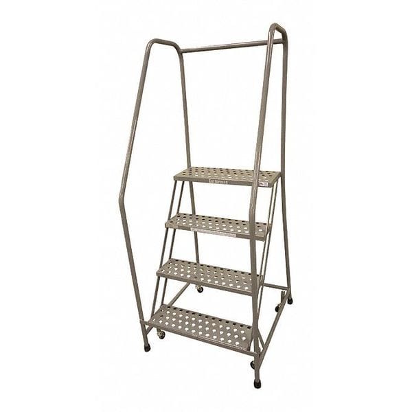 Rolling Ladder, Material Steel, Platform Height 3.3 ft, Handrails Included Yes, Handrail Height 2.5 ft, Overall Height 5.8 ft, Number of Steps 4, Assembled, Load Capacity 450 lb, Step Tread Expanded Metal, Platform Depth 10 in, Platform Width 30 in, Bottom Width 32 in, Base Depth 31 in, Overall Width 32 in, Climbing Angle 59 Degrees , Step Depth 7 in, Step Width 30 in, Ladder Actuation Foot Activated Step Lock, Finish Powder Coated, Color Gray, Standards ANSI, CAl/OSHA Compliant, OSHA Compliant