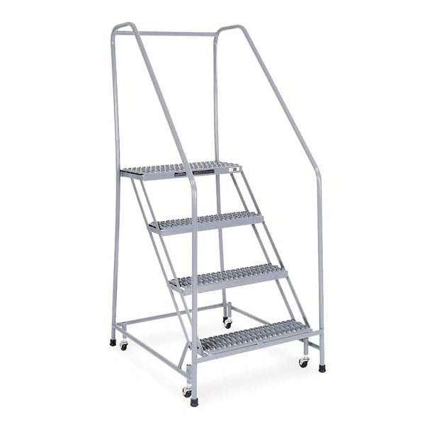 Rolling Ladder, Material Steel, Platform Height 3.3 ft, Handrails Included Yes, Handrail Height 2.5 ft, Overall Height 5.8 ft, Number of Steps 4, Assembled, Load Capacity 450 lb, Step Tread Serrated, Platform Depth 12 in, Platform Width 24 in, Bottom Width 30 in, Base Depth 40 in, Overall Width 30 in, Climbing Angle 50 Degrees , Step Depth 7 in, Step Width 24 in, Ladder Actuation Spring-Loaded Casters, Finish Powder Coated, Color Gray, Standards ANSI, CAl/OSHA Compliant, OSHA Compliant