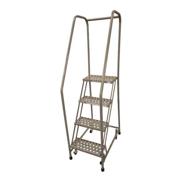 Rolling Ladder, Material Steel, Platform Height 3.3 ft, Handrails Included Yes, Handrail Height 2.5 ft, Overall Height 5.8 ft, Number of Steps 4, Unassembled, Load Capacity 450 lb, Step Tread Perforated, Platform Depth 10 in, Platform Width 16 in, Bottom Width 21 in, Base Depth 54 in, Overall Width 21 in, Climbing Angle 59 Degrees , Step Depth 7 in, Step Width 16 in, Ladder Actuation Weight Activated Step Lock, Finish Powder Coated, Color Gray, Standards ANSI, CAl/OSHA Compliant, OSHA Compliant