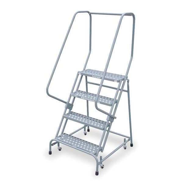 Rolling Ladder, Material Steel, Platform Height 3.3 ft, Handrails Included Yes, Handrail Height 2.5 ft, Overall Height 5.8 ft, Number of Steps 4, Unassembled, Load Capacity 450 lb, Step Tread Serrated, Platform Depth 10 in, Platform Width 24 in, Bottom Width 30 in, Base Depth 31 in, Overall Width 30 in, Climbing Angle 59 Degrees , Step Depth 7 in, Step Width 24 in, Ladder Actuation Weight Activated Step Lock, Finish Powder Coated, Color Gray, Standards ANSI, CAl/OSHA Compliant, OSHA Compliant