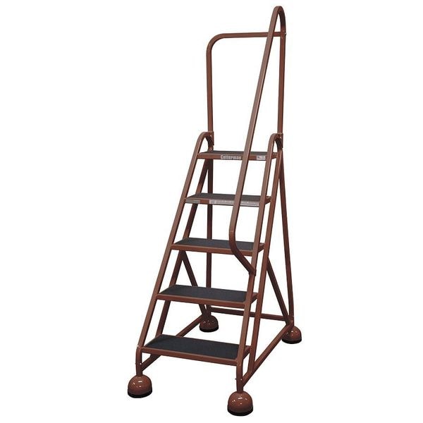 Rolling Ladder, Material Steel, Platform Height 3.8 ft, Handrails Included Yes, Handrail Height 2.5 ft, Overall Height 6.3 ft, Number of Steps 5, Unassembled, Load Capacity 450 lb, Step Tread Antislip Vinyl, Platform Depth 8 in, Platform Width 16 in, Bottom Width 26 in, Base Depth 40 in, Overall Width 26 in, Climbing Angle 56 Degrees , Step Depth 8 in, Step Width 16 in, Ladder Actuation Weight Activated Step Lock, Finish Powder Coated, Color Brown, Standards ANSI, OSHA Compliant