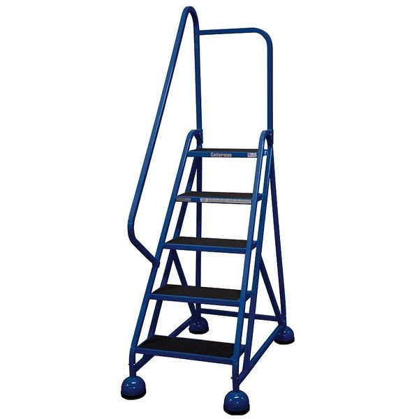 Rolling Ladder, Material Steel, Platform Height 3.8 ft, Handrails Included Yes, Handrail Height 2.5 ft, Overall Height 6.3 ft, Number of Steps 5, Unassembled, Load Capacity 450 lb, Step Tread Antislip Vinyl, Platform Depth 14 in, Platform Width 16 in, Bottom Width 26 in, Base Depth 46 in, Overall Width 26 in, Climbing Angle 56 Degrees , Step Depth 8 in, Step Width 16 in, Ladder Actuation Weight Activated Step Lock, Finish Powder Coated, Color Blue, Standards ANSI, OSHA Compliant
