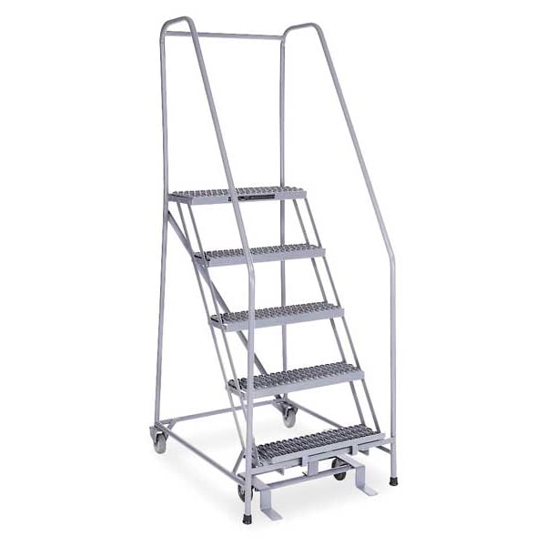 Rolling Ladder, Material Steel, Platform Height 4.2 ft, Handrails Included Yes, Handrail Height 2.5 ft, Overall Height 6.7 ft, Number of Steps 5, Assembled, Load Capacity 450 lb, Step Tread Serrated, Platform Depth 10 in, Platform Width 24 in, Bottom Width 30 in, Base Depth 40 in, Overall Width 30 in, Climbing Angle 59 Degrees , Step Depth 7 in, Step Width 24 in, Ladder Actuation Foot Activated Step Lock, Finish Powder Coated, Color Gray, Standards ANSI, OSHA Compliant, Rear Exit No