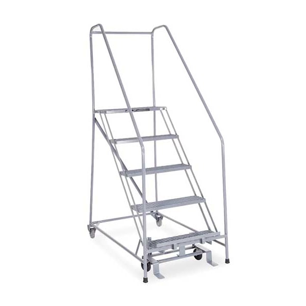 Rolling Ladder, Material Steel, Platform Height 4.2 ft, Handrails Included Yes, Handrail Height 2.5 ft, Overall Height 6.7 ft, Number of Steps 5, Assembled, Load Capacity 450 lb, Step Tread Expanded Metal, Platform Depth 12 in, Platform Width 24 in, Bottom Width 30 in, Base Depth 51 in, Overall Width 30 in, Climbing Angle 50 Degrees , Step Depth 7 in, Step Width 24 in, Ladder Actuation Foot Activated Step Lock, Finish Powder Coated, Color Gray, Standards ANSI, OSHA Compliant, Rear Exit No